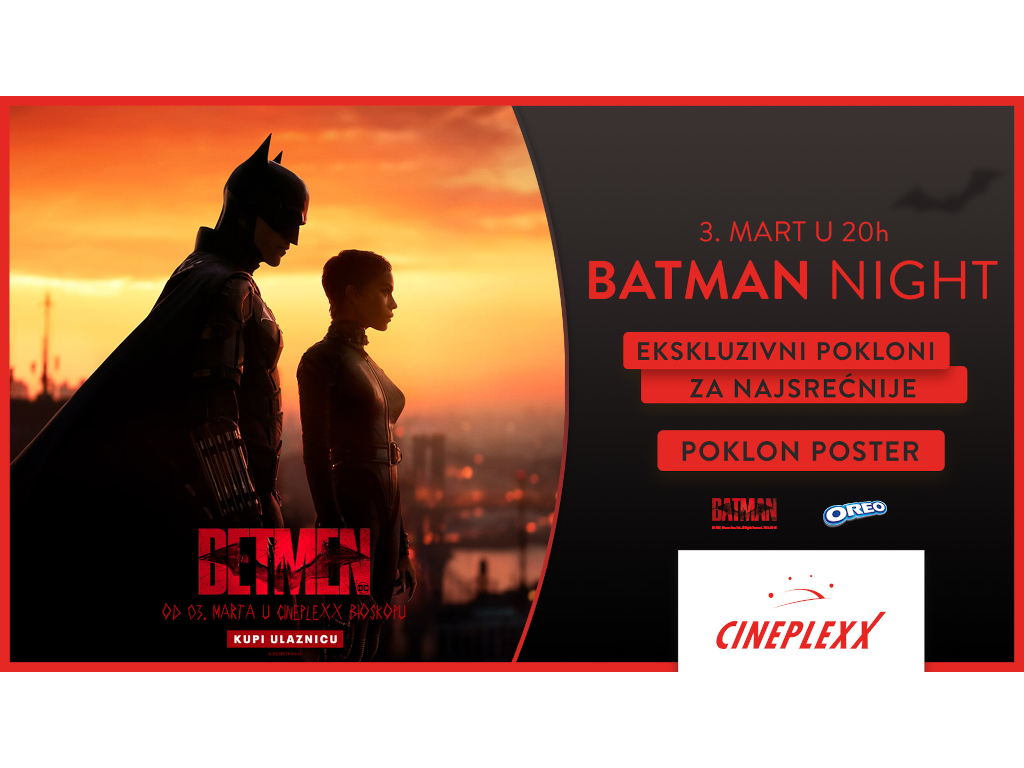 Batman night očekuje gledaoce u četvrtak, 3. marta od 20 časova uz poklon originalni poster filma za sve fanove, ali i poklone iz filma za najsrećnije kao i poklone partnera. Ulaznice su u prodaji na blagajni Cineplexx Niš bioskopa i putem aplikacije CineplexxRS.