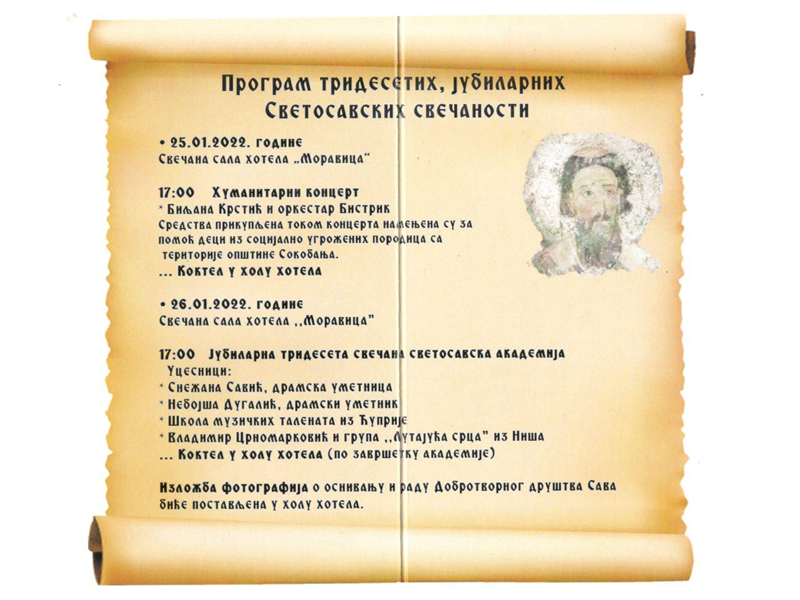 I ove godine Društvo organizuje obeležavanje dana Svetog Save u hotelu “Moravica” i to 26.1.2022.godine sa početkom od 17 časova uz prigodan program gde će učestvovati poznati dramski umetnici Snežana Savić i Nebojša Dugalić dok će muzički deo obogatiti učenici škole za muzičke talente iz Ćuprije.