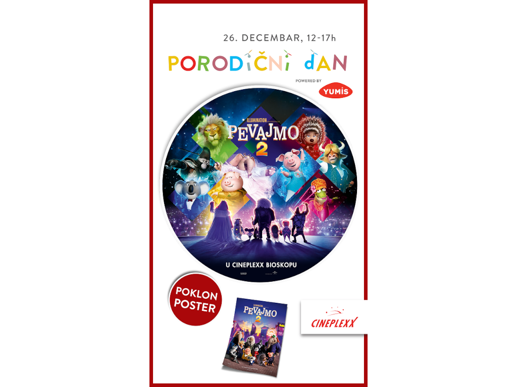 U vreme novogodišnjih praznika, sinhronizovana animacija ,”Pevajmo 2” stiže sa velikim snovima i hit pesmama. Ulaznice su u prodaji na blagajnama bioskopa i putem aplikacije CineplexxRS.