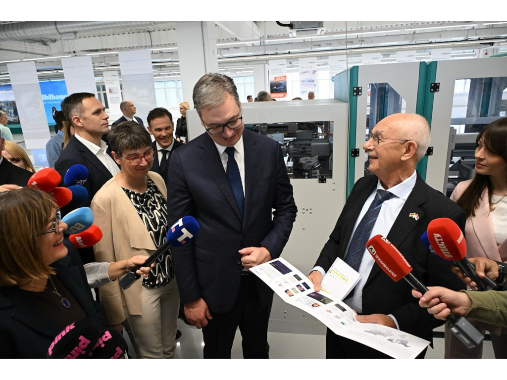 Vlasnik fabrike Jozef Milbauer pokazao je Vučiću kako se na jednoj od mašina, vrednoj pola miliona evra, prave biometrijski dokumenti, uz napomenu da je to nemačko-srpska-bavarska tehnologija.